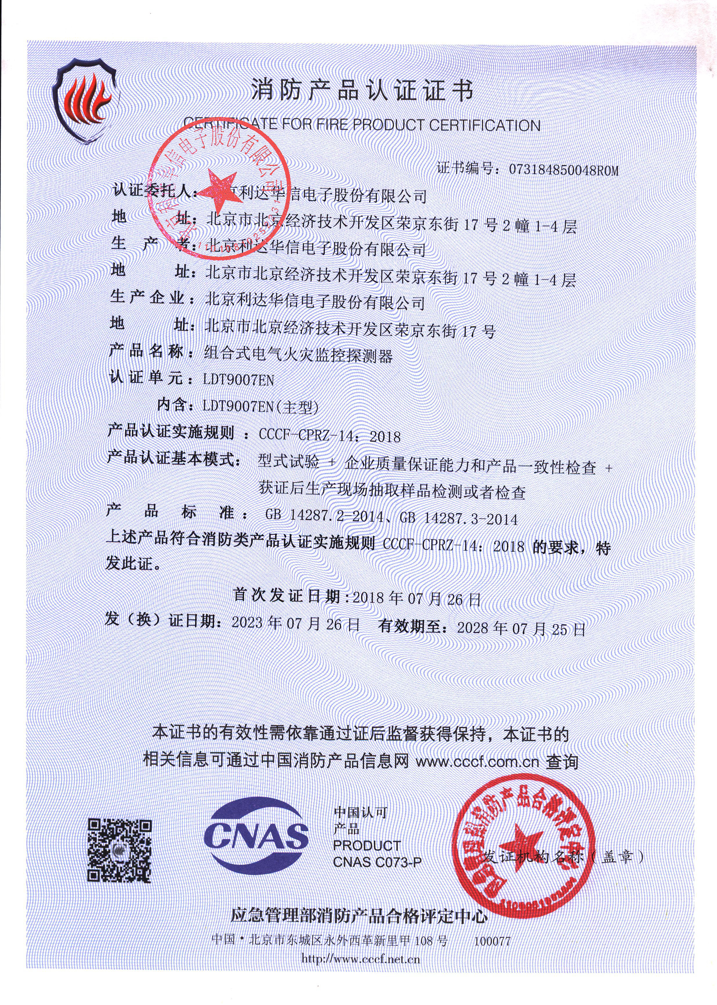 LDT9007EN 組合式電氣火災(zāi)監(jiān)控探測器 消防產(chǎn)品認(rèn)證證書073184850048ROM(蓋公章).jpg